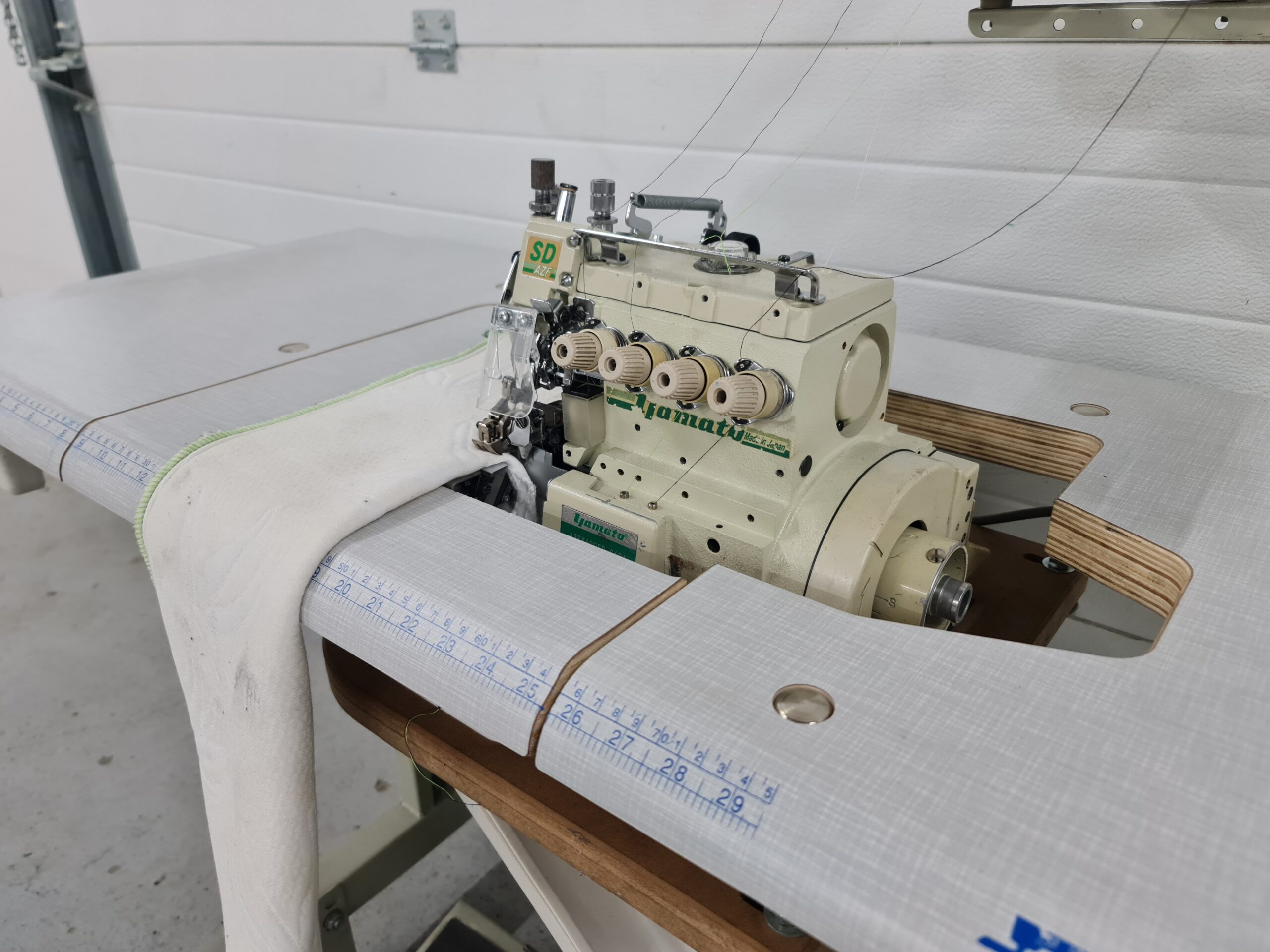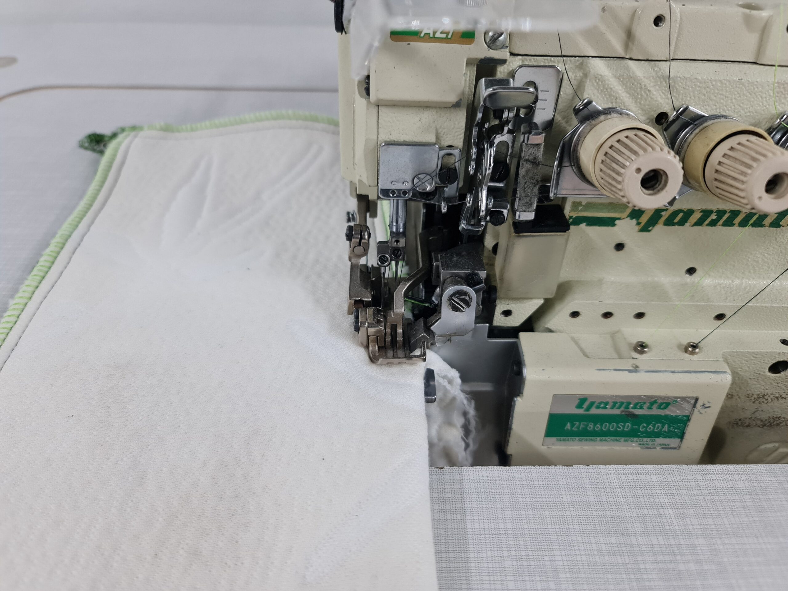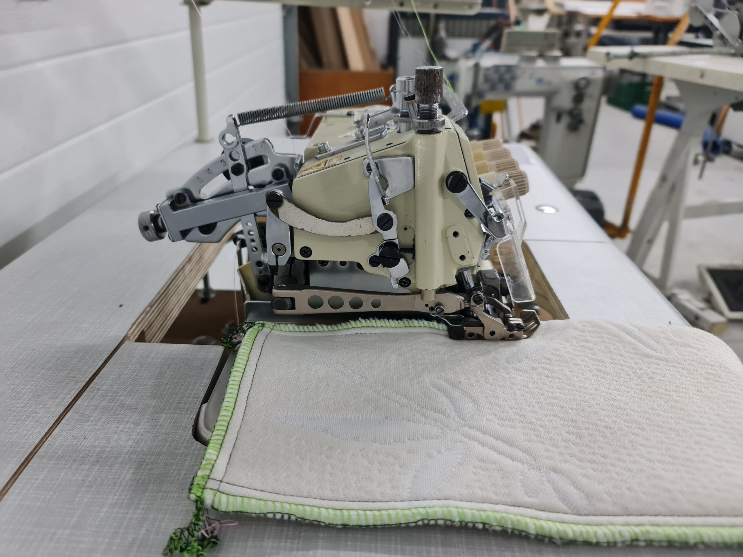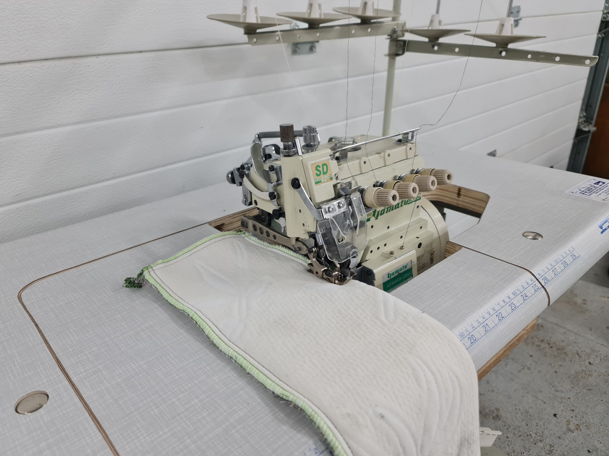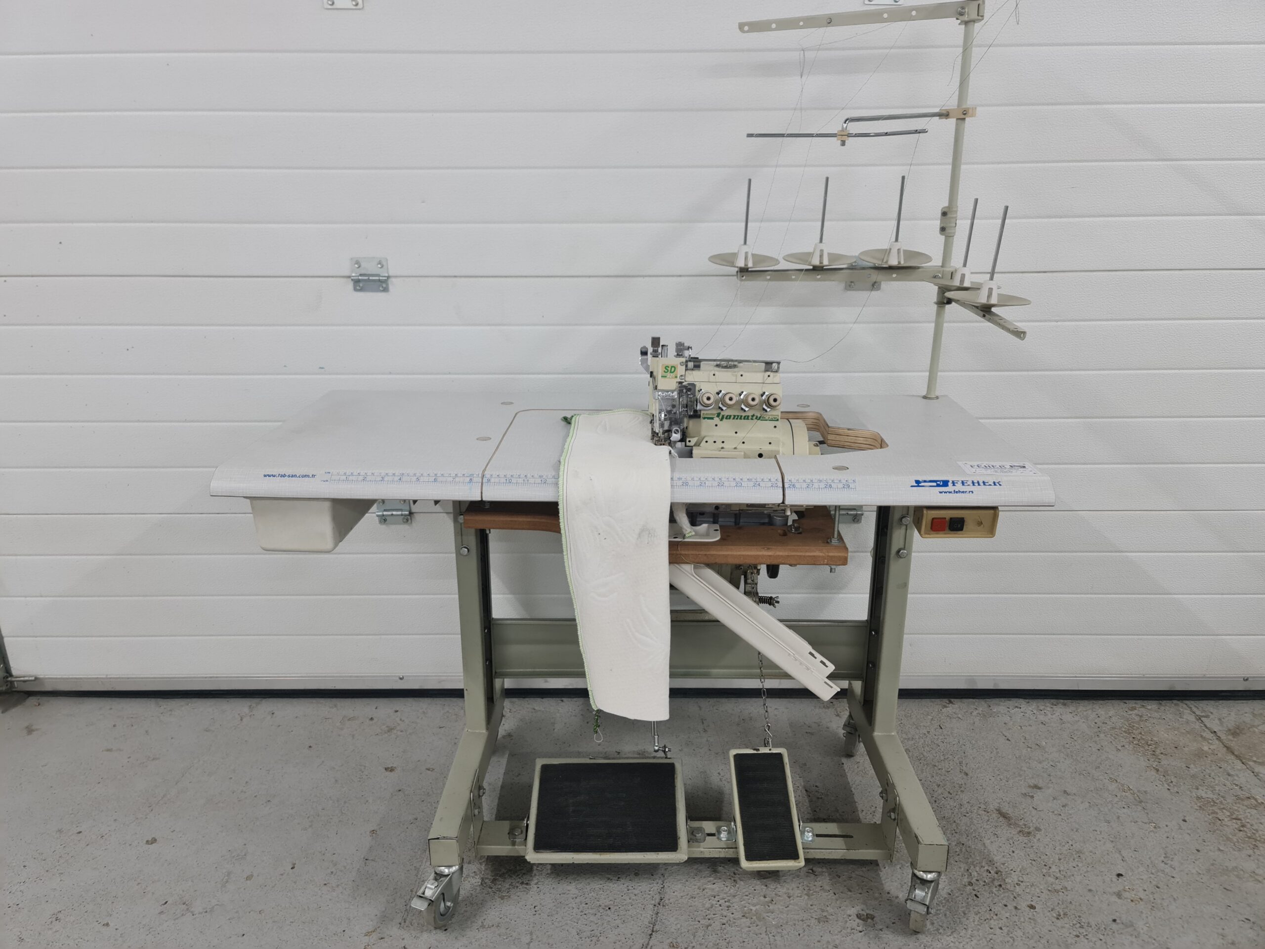 Overlock masina sa gornjim diferencijalnim transportom za jake materijale poput džinsa.